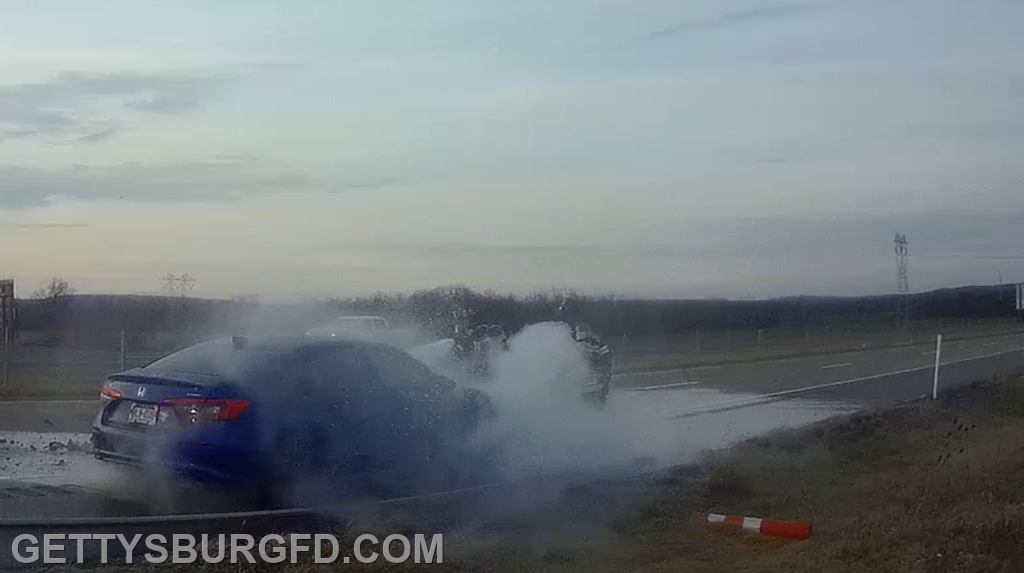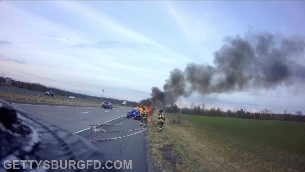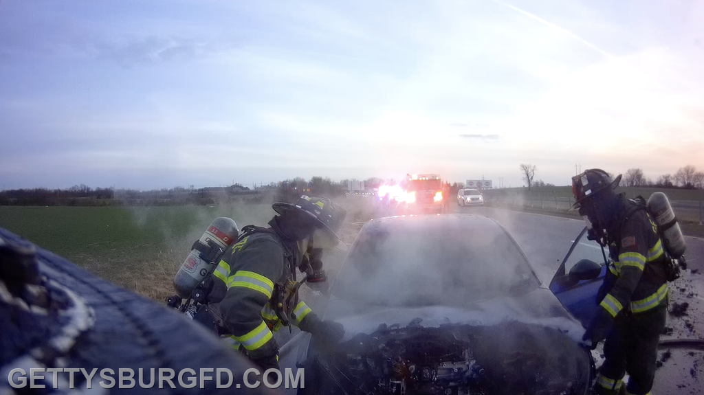Engine 1-2 responded with four and arrived to find a Honda Civic with a well-involved engine compartment. Engine 1-2 blocked the slow lane, established command and stretched the bumper line for extinguishment. Due to the location of the incident being just around a curve in the highway, command requested that fire police shut down US 15 northbound at the York Road interchange.