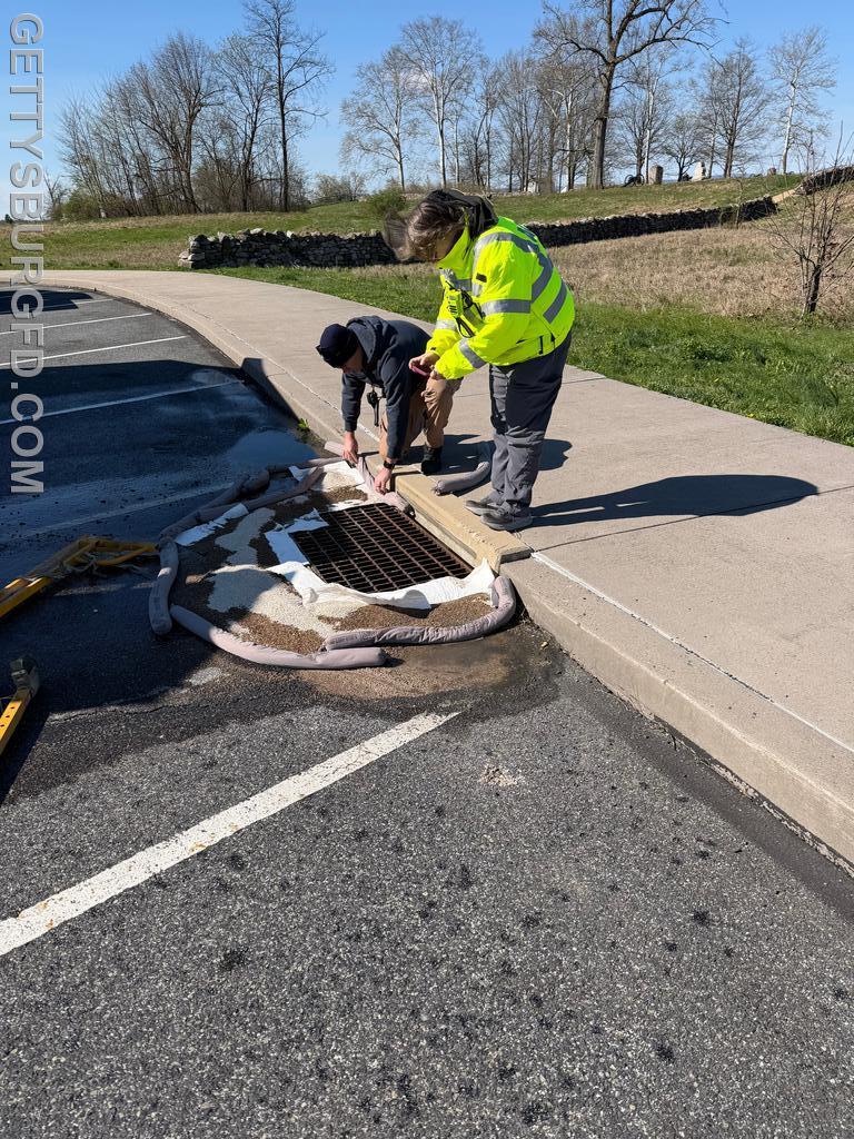 The spray foam insulation product was non-toxic, but notification and response were required from Adams County Emergency Management Agency and Haz-Mat personnel from Franklin County Company 13 (Letterkenney) for consultation and cleanup. This was necessary because the product had entered a nearby storm drain and the incident occurred on federal property. Gettysburg Fire Department and Company 22 personnel conducted initial damming and diking of the storm drain.